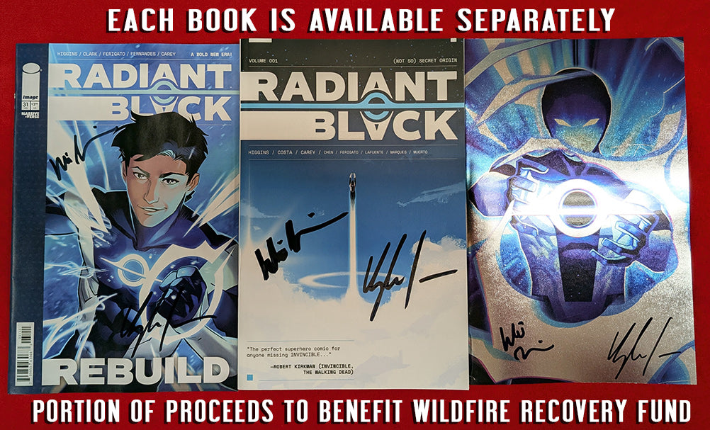 From the official Massive-Verse Rebuild Launch Signing that happened on 3/1/25, these are comics and a graphic novel, signed by Massive-Verse creator and writer of Radiant Black, Kyle Higgins, and the voice of Radiant Black (as well as the voice of Batman Beyond, and Eric Matthews on Boy Meets World), Will Friedle.
