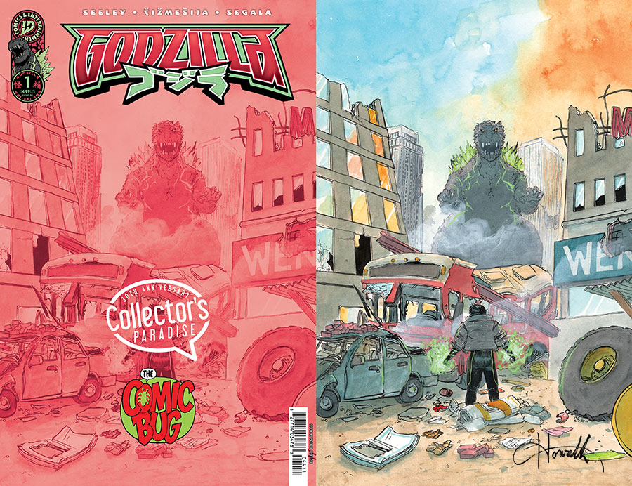 This is a LIMITED Variant to the first book of the new GODZILLA KAI SEI ERA UNIVERSE: Godzilla #1.There will be 3 books and all 3 will have an exclusive cover, with all 3 covers connecting into an amazing image, drawn in luscious water colors by the incredible Patrick Horvath (Beneath The Trees Where Nobody Sees). The three books are: Godzilla Kai Sei Age #1, Godzilla: Escape the Deadzone #1 and Starship Godzilla #1